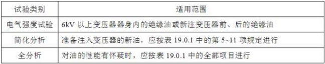 2、新油验收及充油电气设备的绝缘油试验分类,应符合表19.0.2的规定。